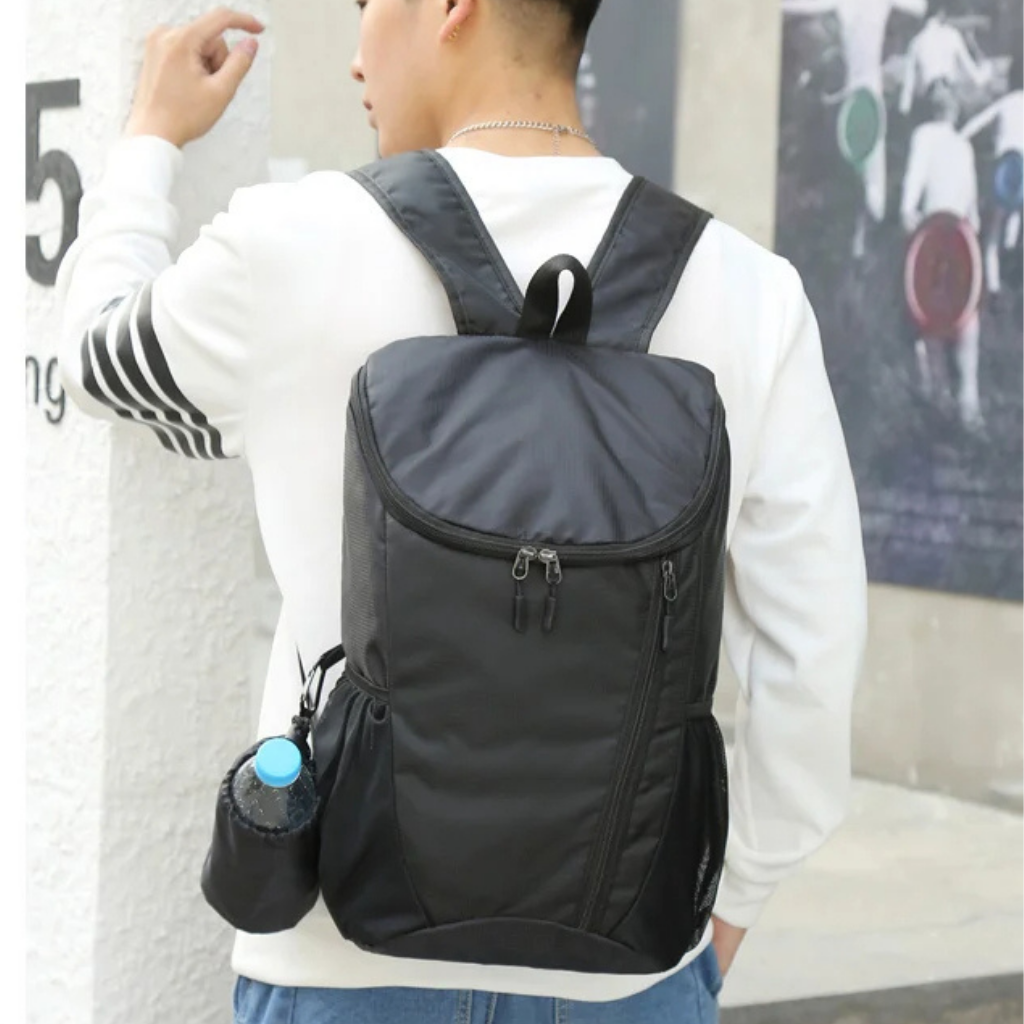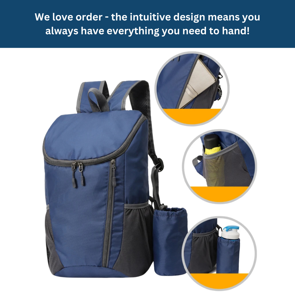 The Compact backpack is characterized by its breathable shoulder straps, ensuring a comfortable wearing experience even during extended periods. Additionally, it is foldable and can be stored compactly to save space. A side bottle holder also provides easy access to your drinks while on the go.