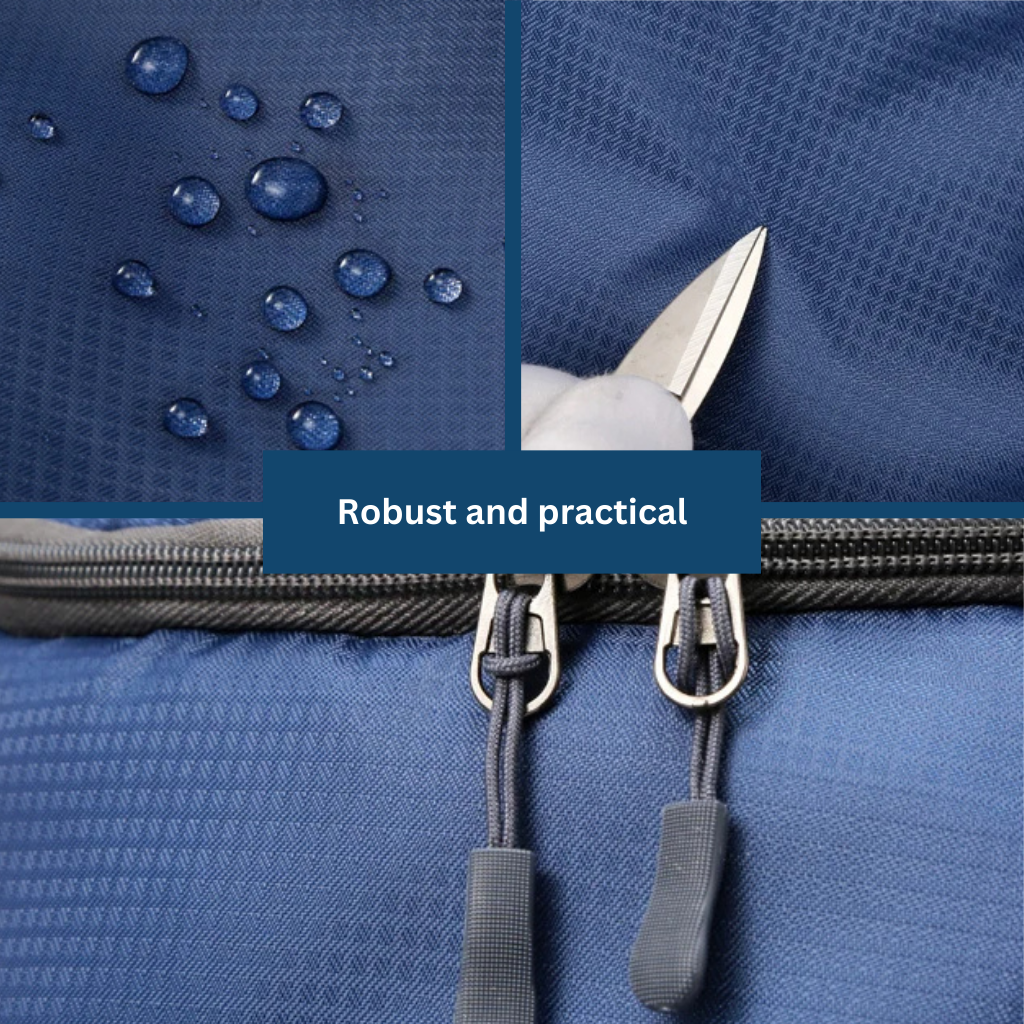 The high-quality, water-resistant nylon material protects your belongings from moisture and wear. The high density of the nylon also provides extra durability and longevity. A strong two-way zipper ensures smooth opening and closing, while the extended nylon zippers are easy to handle.