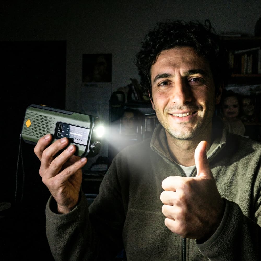 The NaturVibes Compact Emergency Radio with solar panel, hand crank, and SOS function was designed for moments when independent power supply and trustworthy information are essential.