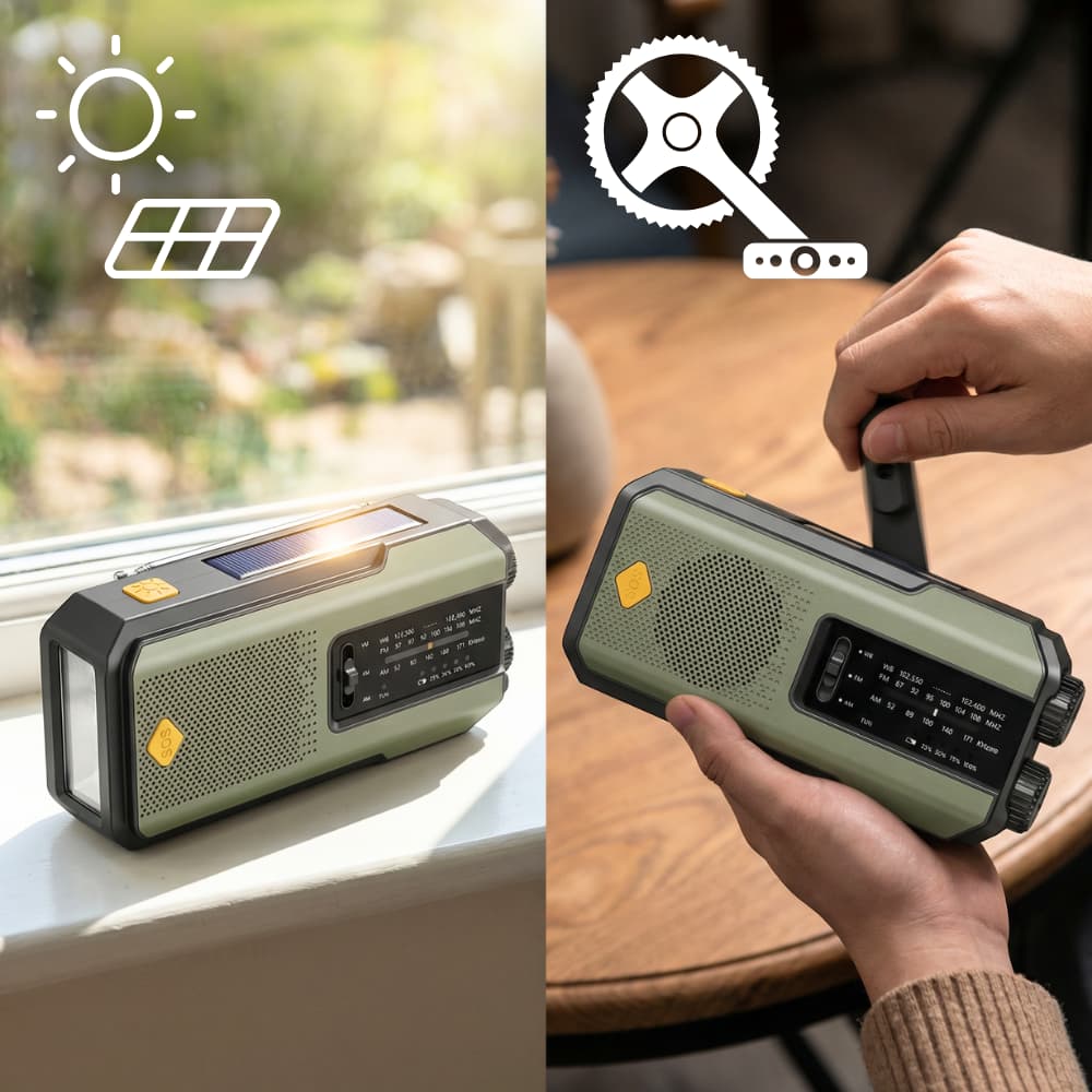 Compact Emergency Radio with Solar, Hand Crank & SOS Function