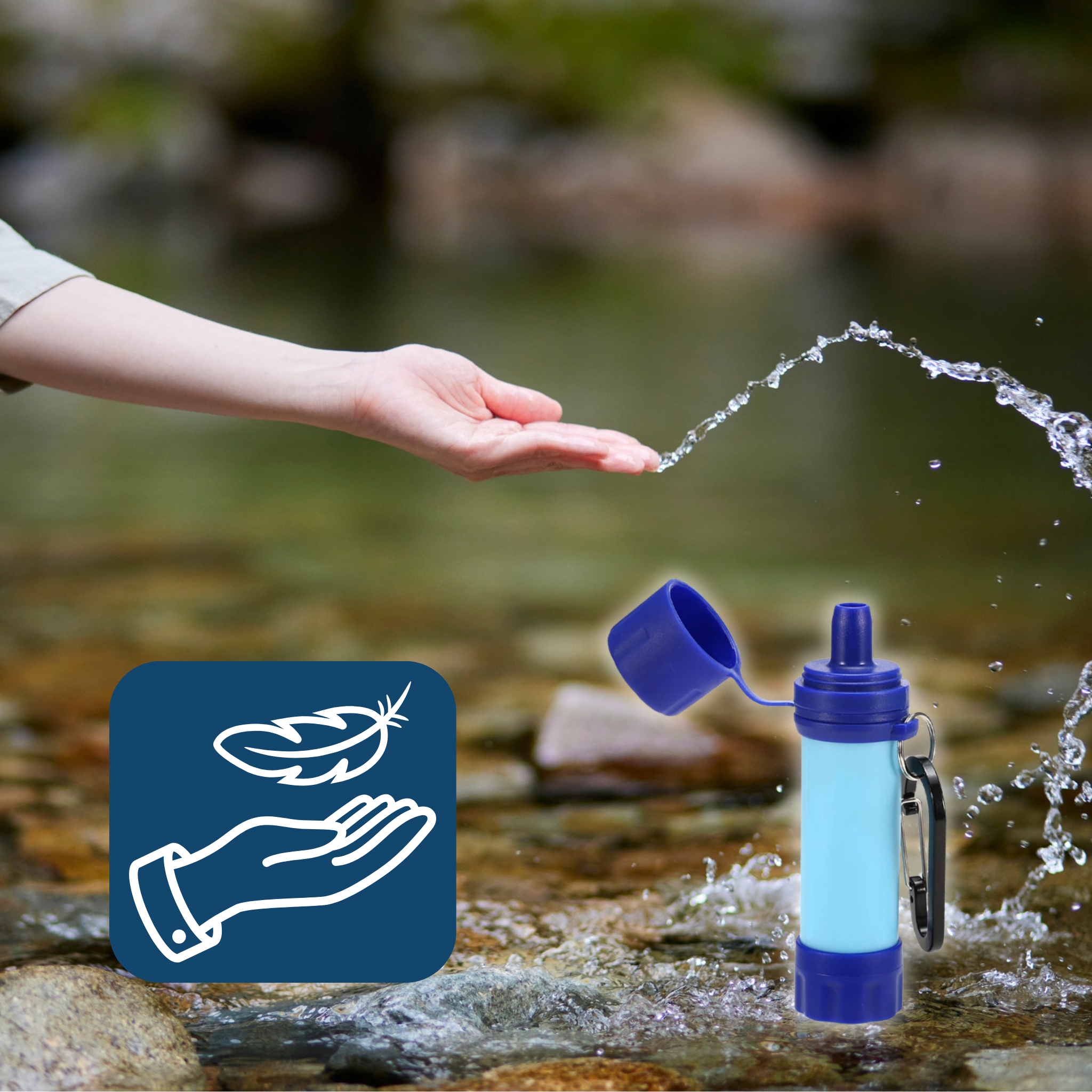 The filter removes up to 99.99% of bacteria, microorganisms, and contaminants from natural water sources. You can drink clean water directly with the integrated straw.