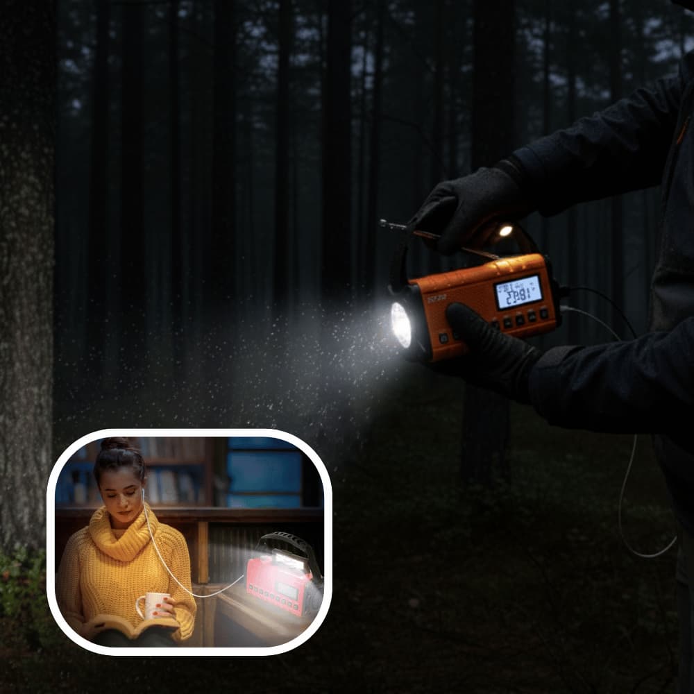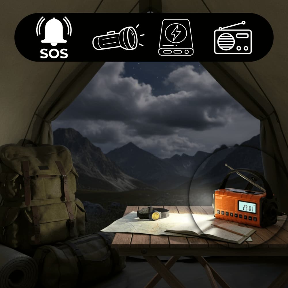 It combines radio, LED flashlight, reading light, power bank, and SOS alarm in one compact device—keeping you informed, illuminated, and prepared anywhere.